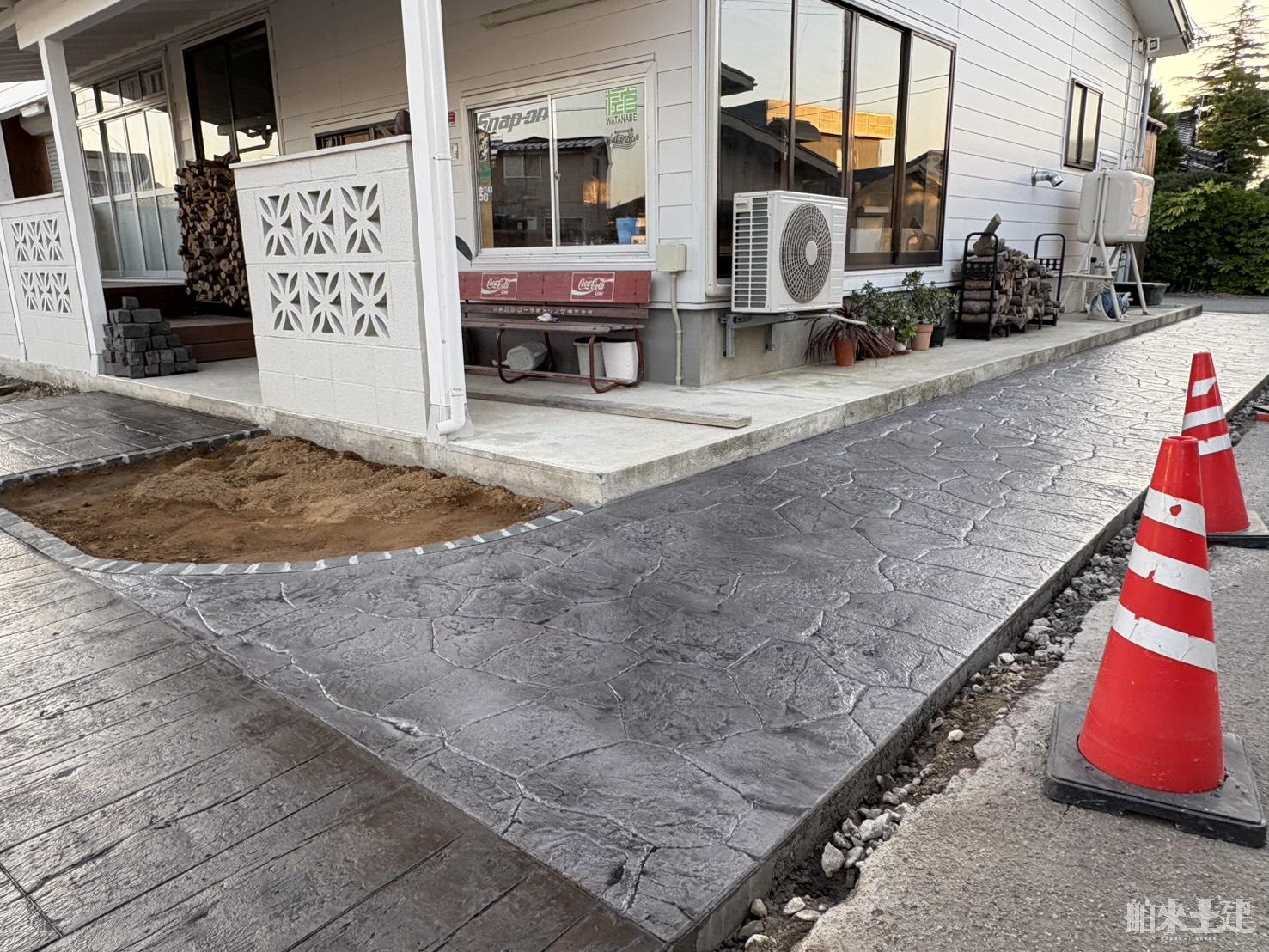 事務所周りに石目調のスタンプコンクリートを施工 落ち着いた雰囲気で景観アップ