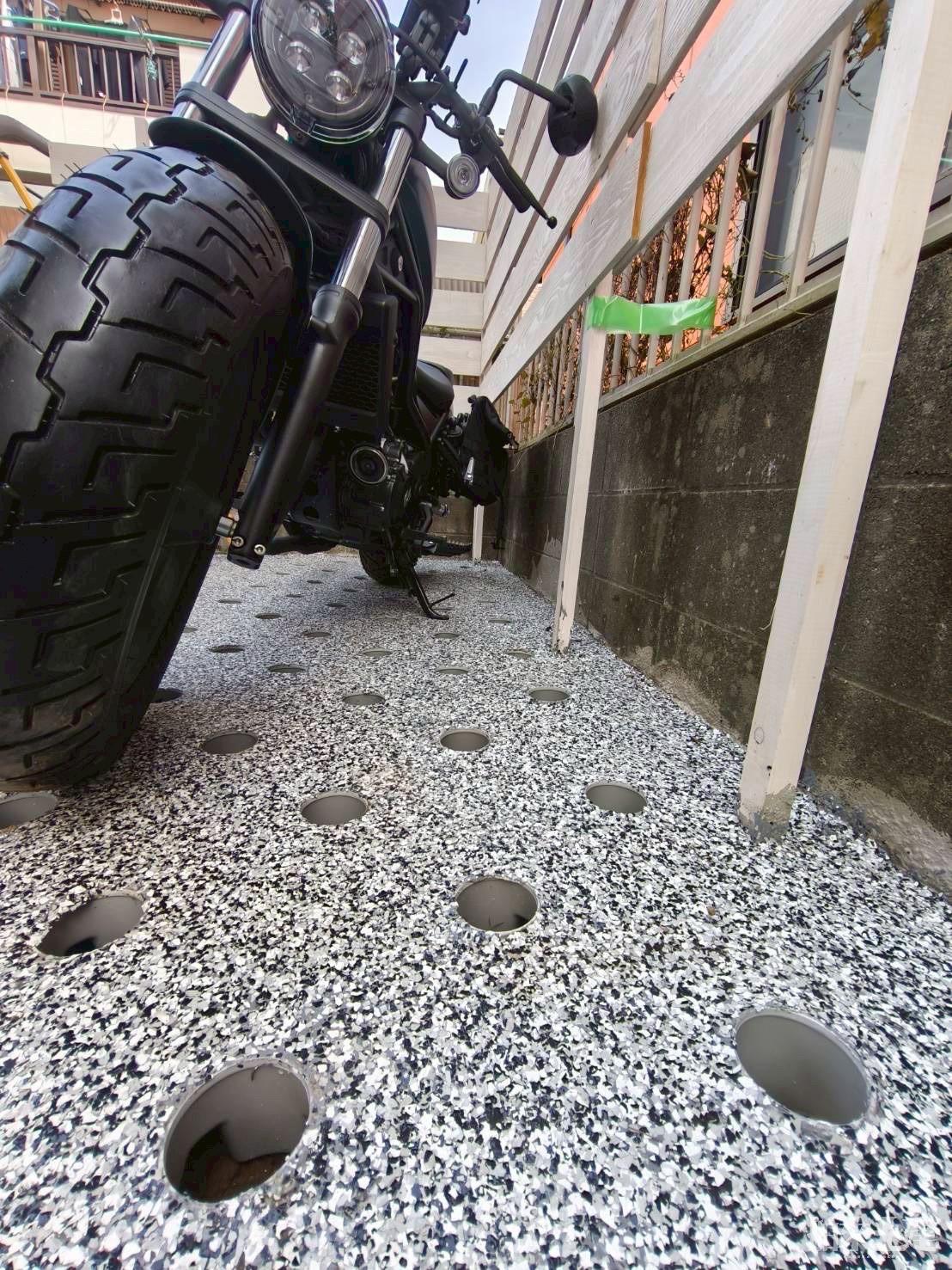 白・黒・グレーのフレークが織りなすモザイク調のベースに、等間隔でドット状に穴を抜いた「ドットコン」デザインを採用。施工主様のバイクの世界観ともマッチし、他にはない印象的なガレージスペースが完成しました。