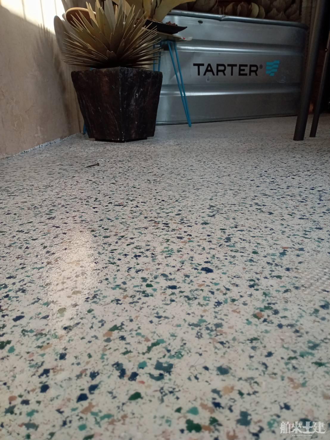 事務所の床面に、デザイン性と機能性を兼ね備えた「ポリフレーク」を施工しました。多色のフレークが散りばめられた華やかな仕上がりは、空間全体の印象を明るく、そして個性的に演出。細かなフレークが床に表情を与え、植物や内装とも相性抜群です。