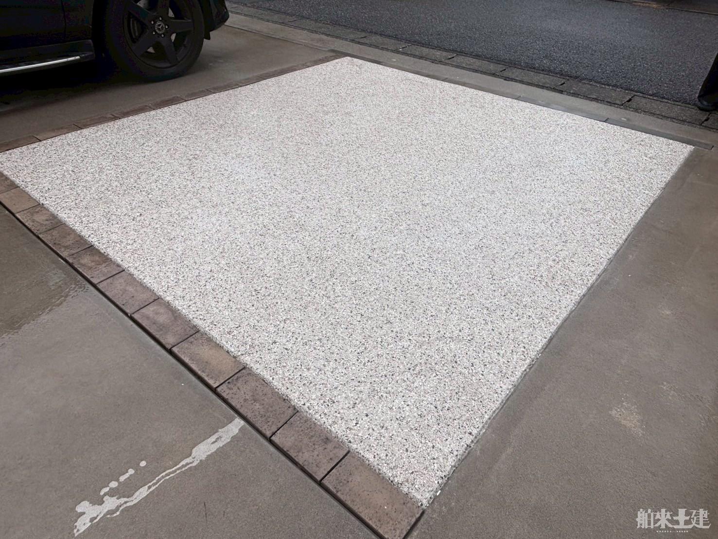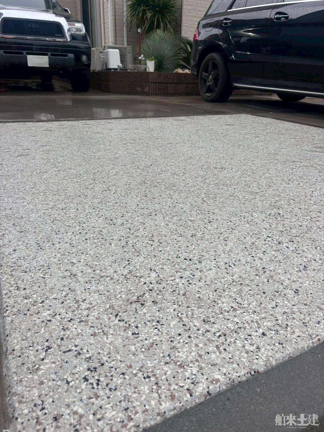 ポリフレークは見た目のおしゃれさだけでなく、耐久性・防汚性・滑りにくさにも優れているため、重量級の車両が繰り返し出入りする場所にも最適です。