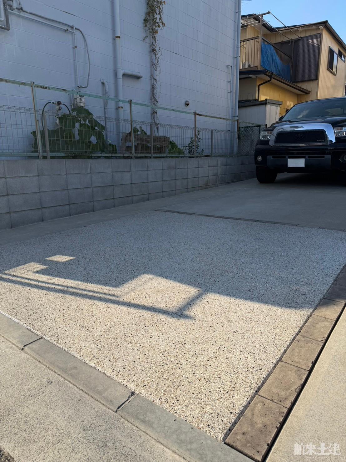 大きなアメリカンピックアップトラックが悠々と乗り入れるご自宅の駐車スペースに、ポリフレークを施工させていただきました。