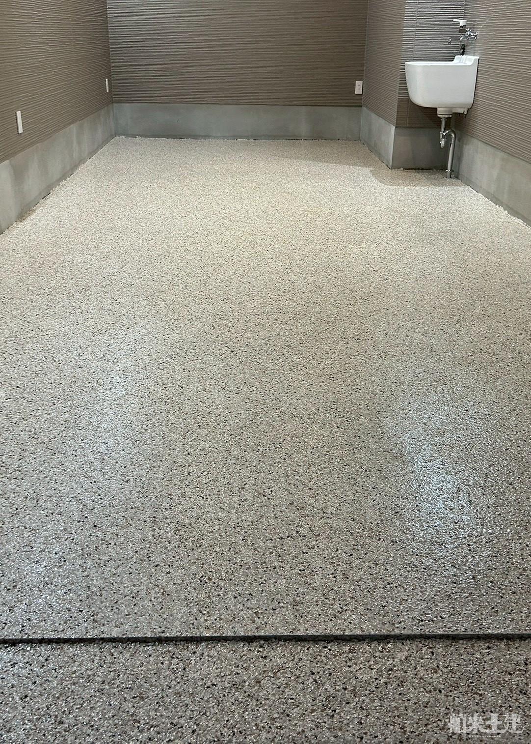 コンクリート下地の上にポリフレークを施すことで、無機質になりがちなガレージ空間に、上質で清潔感のある表情を与えています。