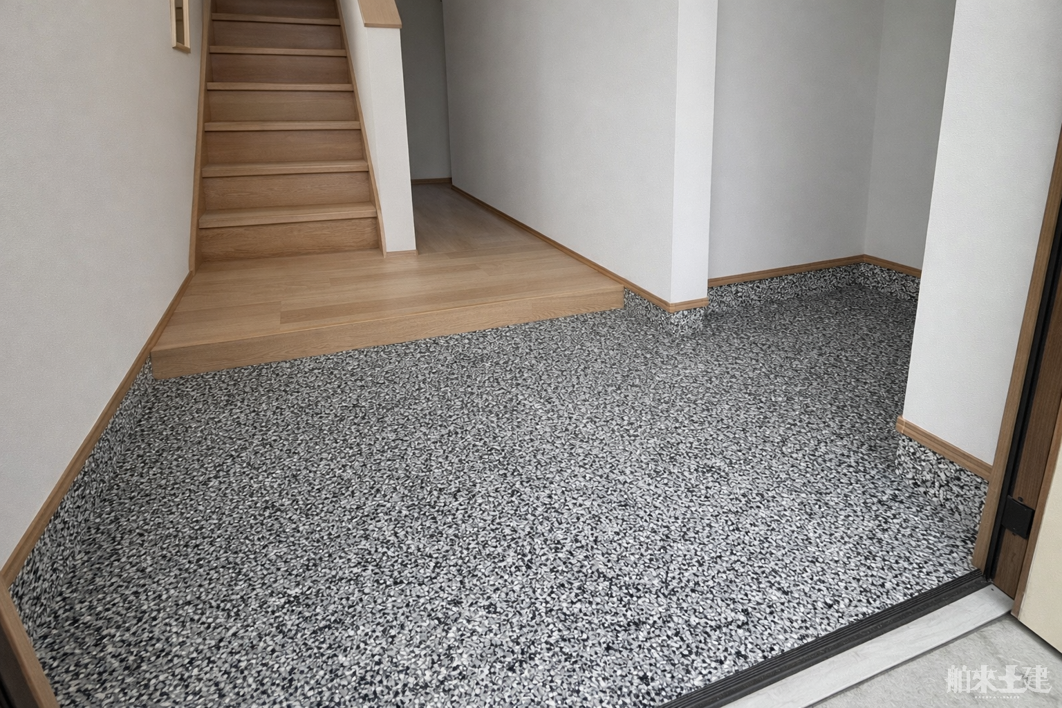 新築住宅の玄関床に、ポリフレーク仕上げを採用した施工事例です。