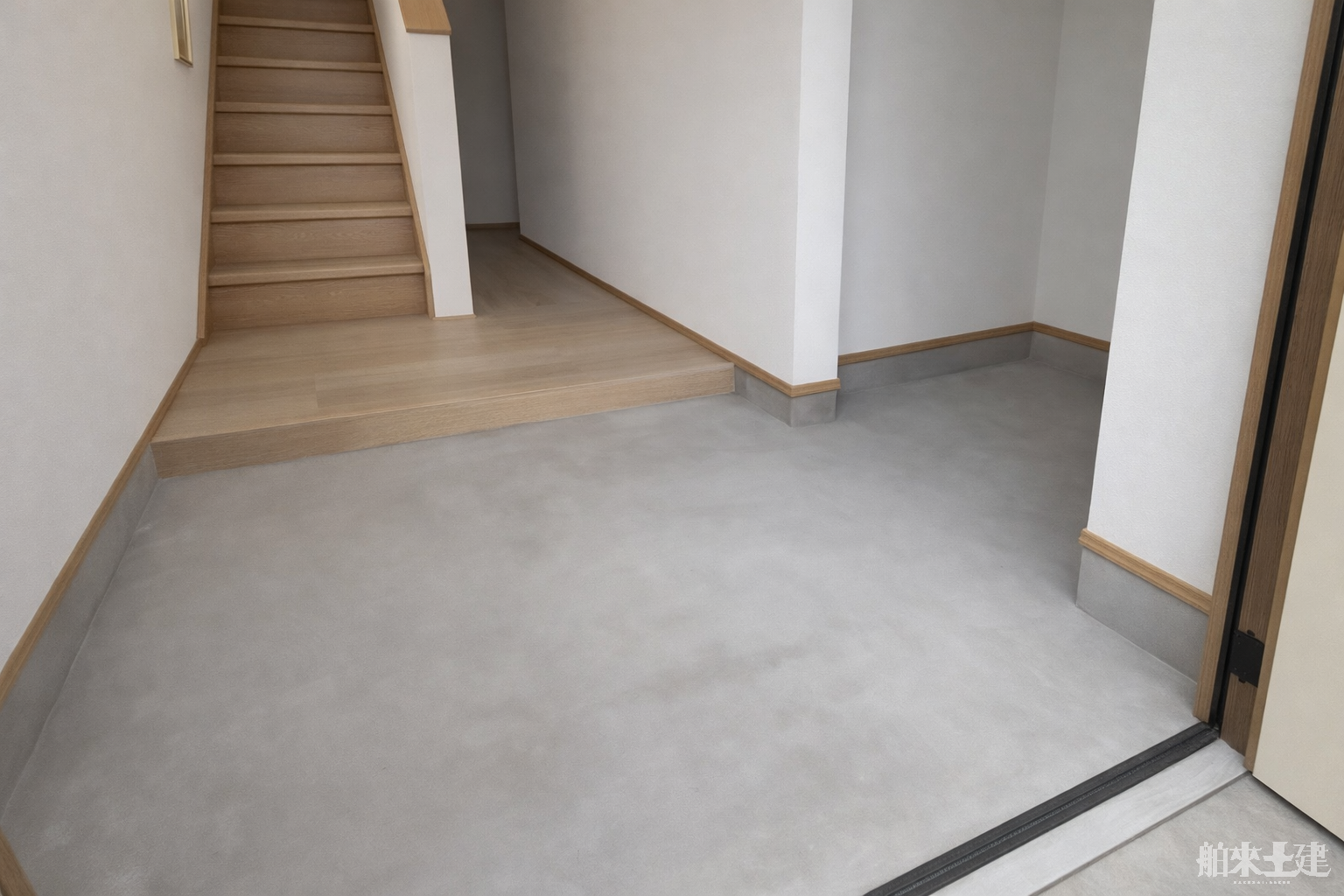 玄関という「外と内をつなぐ場所」にふさわしく、清潔感と耐久性を兼ね備えた床となっています。