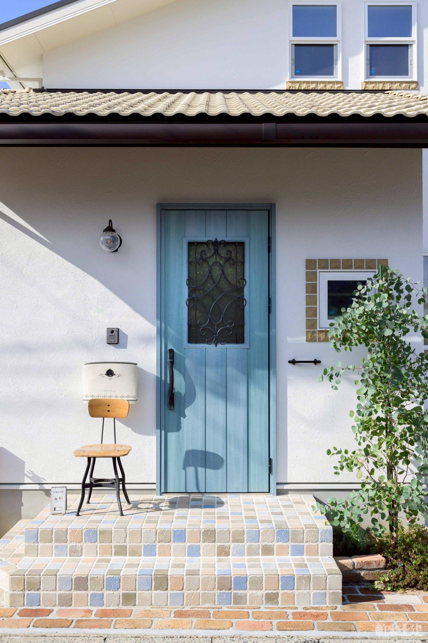 玄関上部に設けられた小窓とタイルのアクセントが、