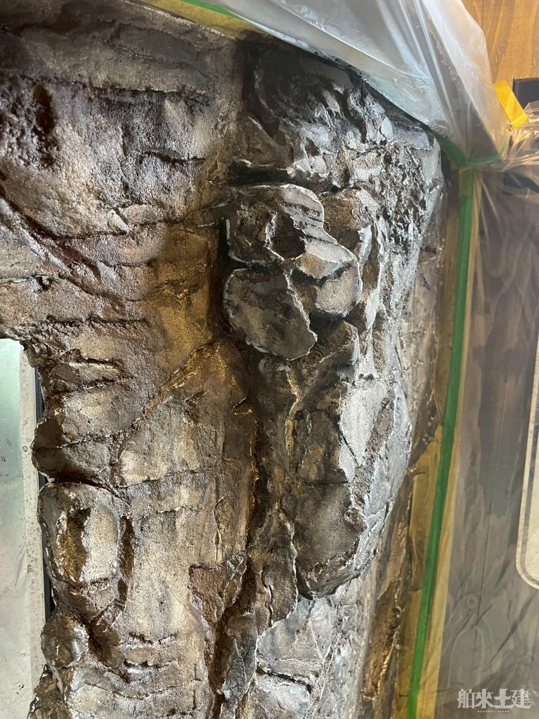 事務所内に設置された大型水槽の外周を、岩造形で仕上げた施工事例です。