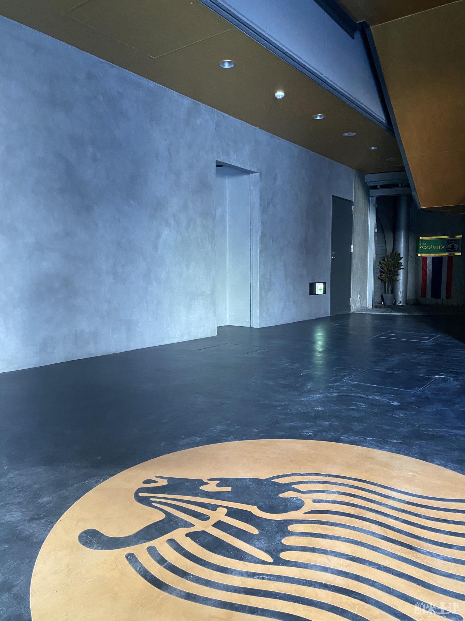 ビルエントランスの床をMPCで仕上げ、象徴的なライオンマークをステンシルで表現した施工事例です。