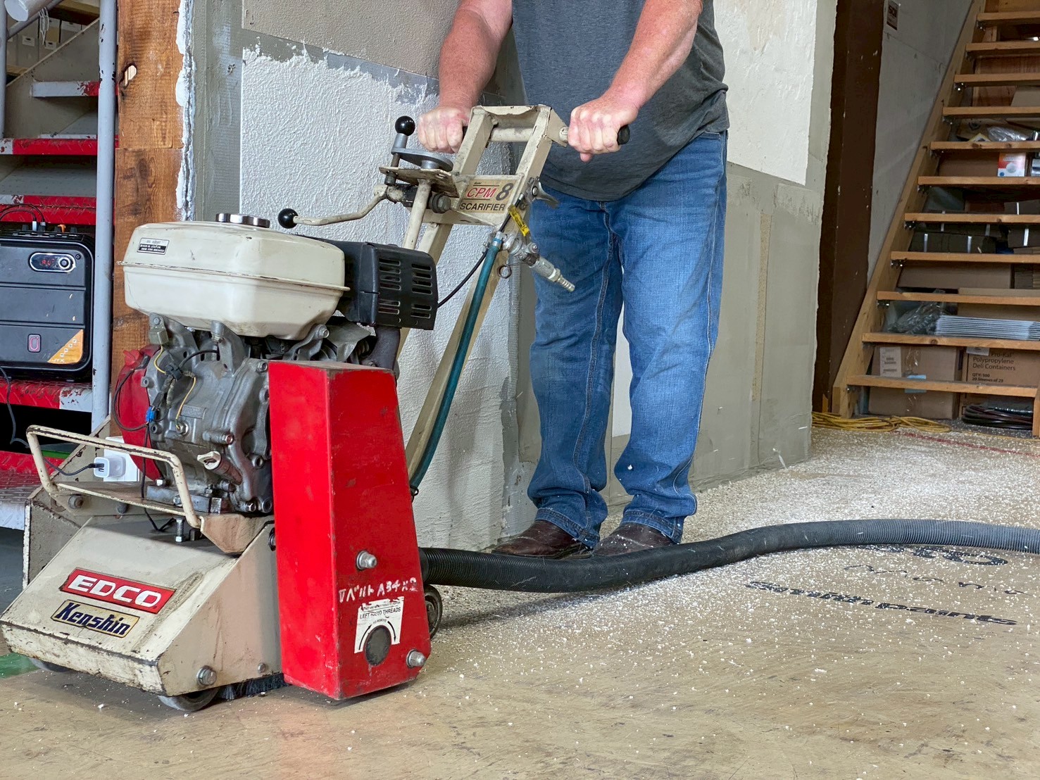 下地調整前に密着を高めるための初期作業としてケズラーというコンクリート削り機材も初めて操作させてもらいました。機械を使う、使わないでの比較も肌で体験できましたが、絶対機械は使いましょうと答えも即決です。