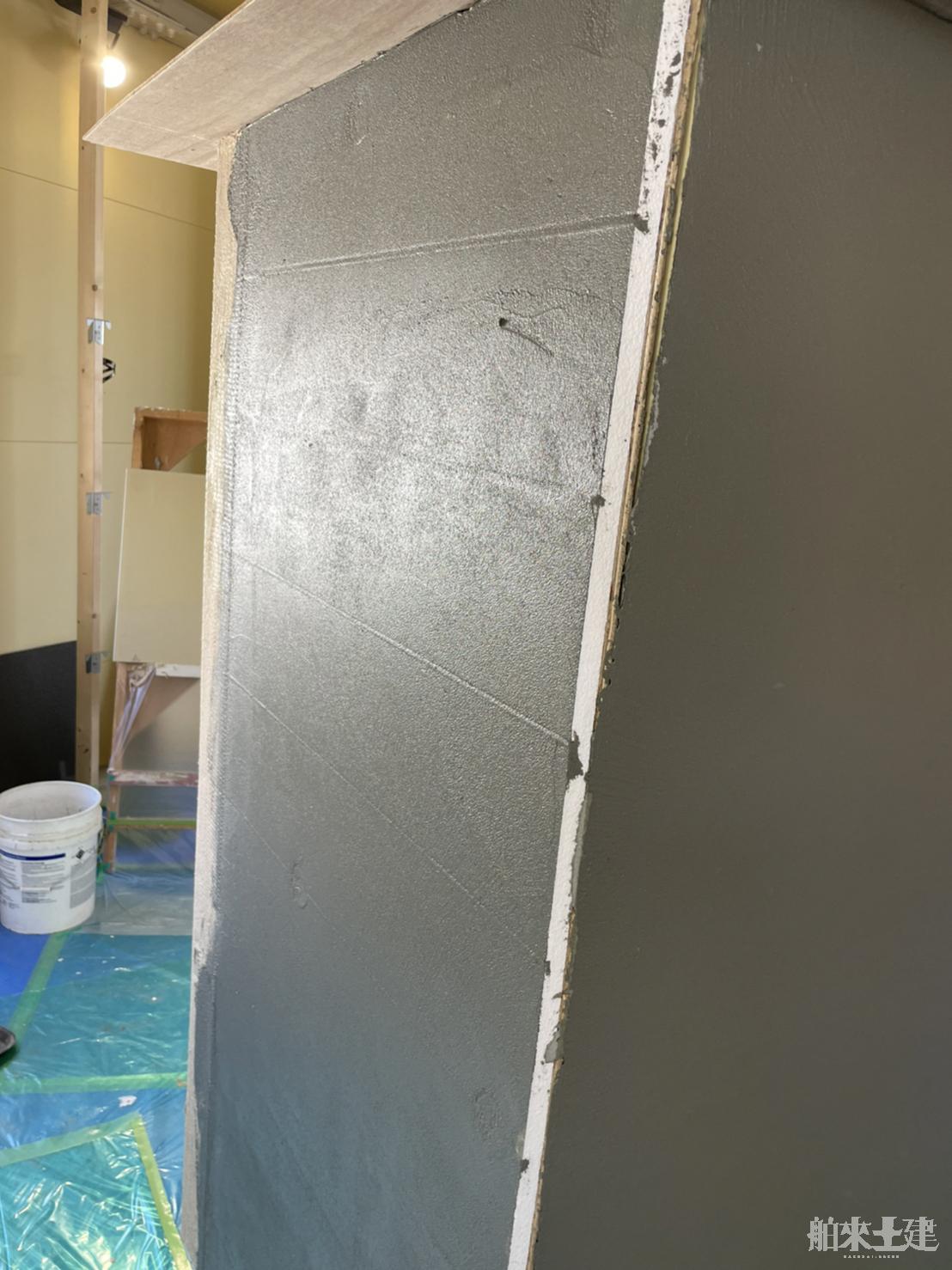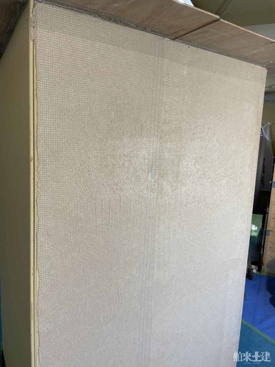 凹み部分にはスキムコート(水で伸ばした下地材)です。これにより凸凹を無くし施工面をよりフラットにします。