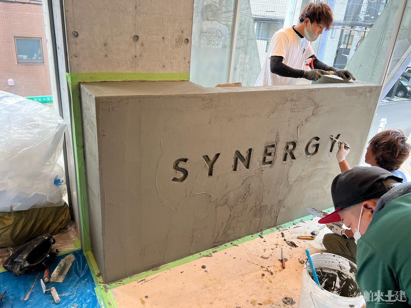 モルタル調のカウンターと床を
