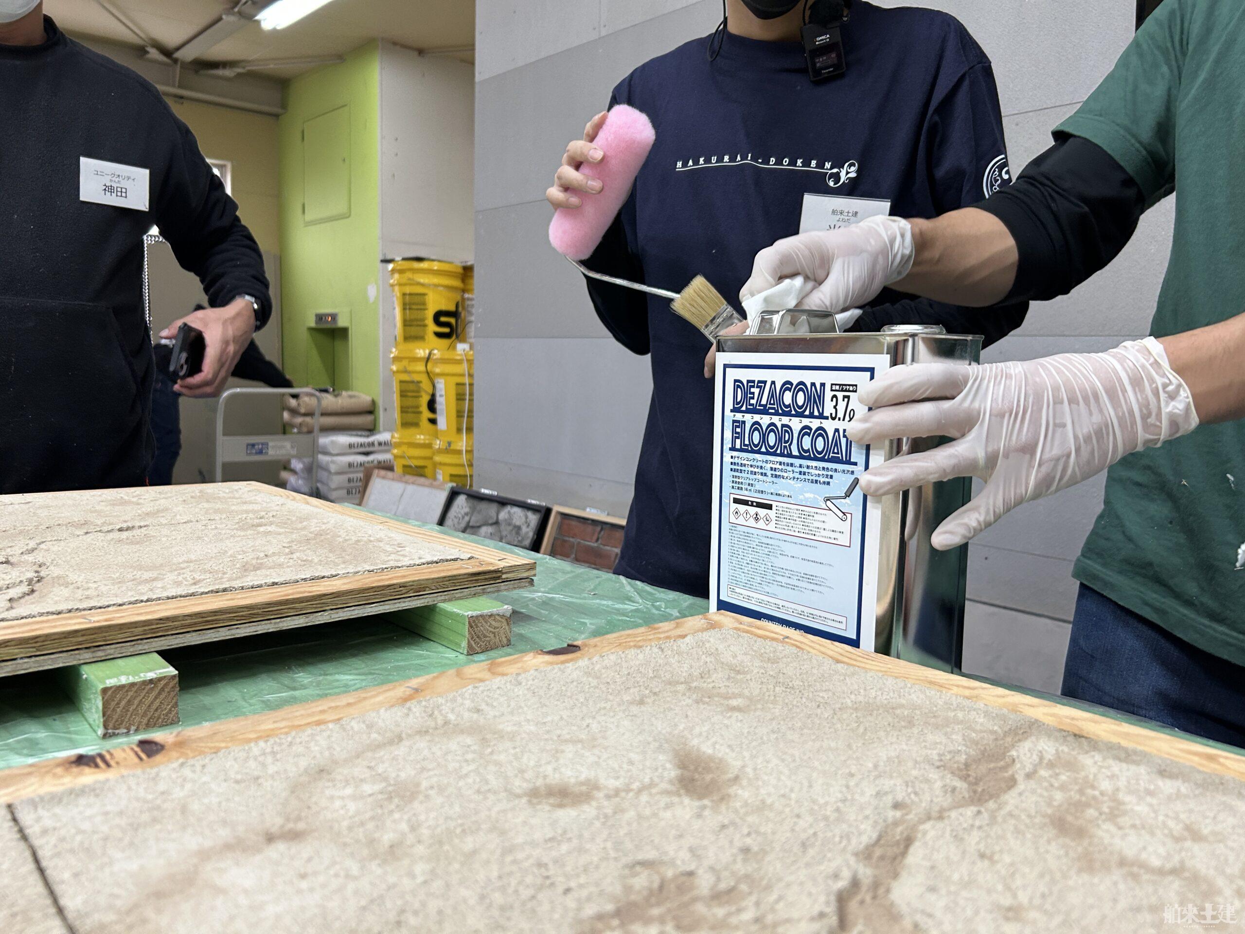 3種類のデザインコンクリートの実習だけでなく。実際の施工例見学や営業、広告活動の研修、そして研修後の施工立ち合いや現場誘致などのアフターフォローもさせていただいております。